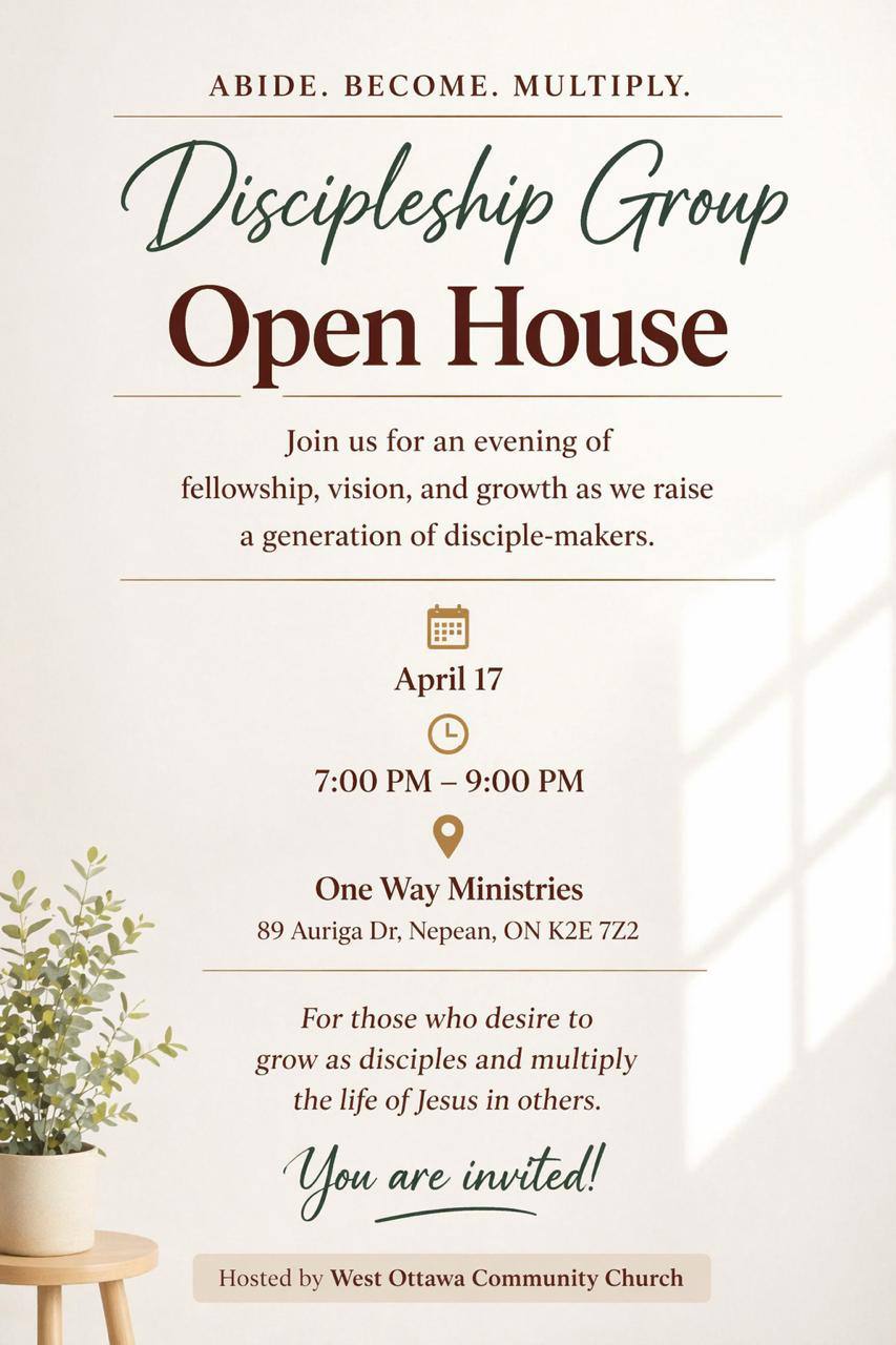 17 April 7-9pm Discipleship Group Open House. RSVP. More details from info@wocc.ca (POSTER)